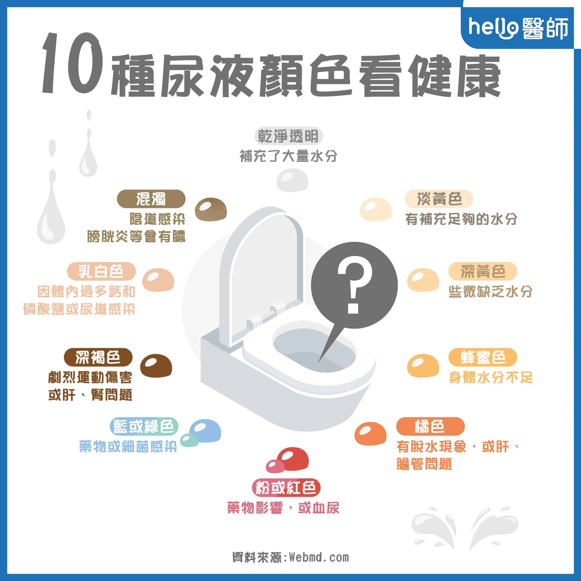 尿液的顏色其實多少透露出健康狀態,不同顏色可能代表著不同的身體狀況:
