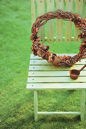裝飾果實時,記得掌握重在下、輕在上的原則,例如形狀較大顆的松果,適合放置花圈下方,再利用細長的山歸來和橡實點綴其中,這樣可避免花圈頭重腳輕,又能做出豐盛的構圖。